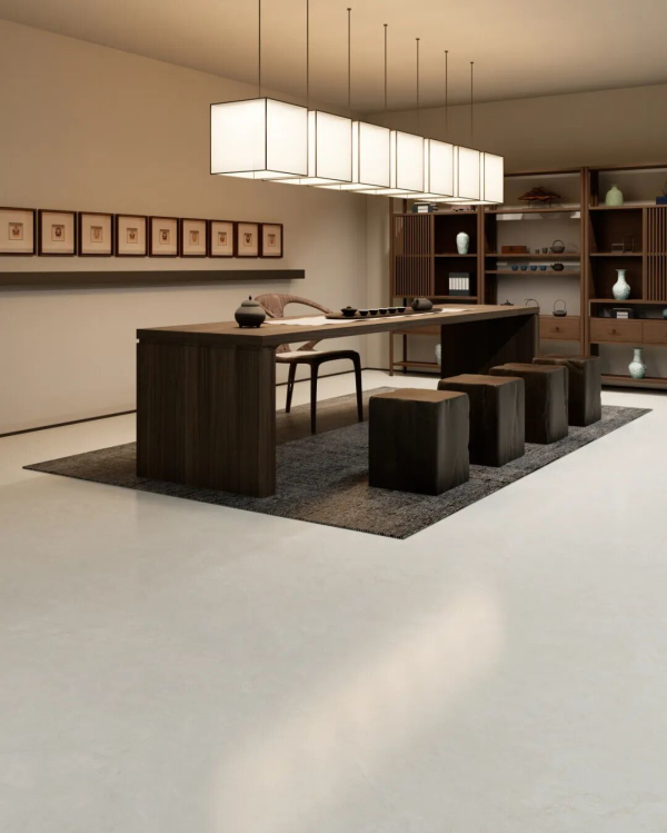 復(fù)嶂層巒一徑紓,綠筠蒼栝密還疏,凹凸有致的復(fù)刻紋理如遠(yuǎn)眺的山巒,層連疊嶂地向遠(yuǎn)方舒展。與中式簡(jiǎn)約線(xiàn)條的竹節(jié)造型燈具,讓茶室禪意更濃。