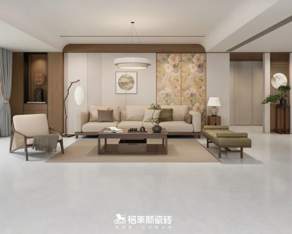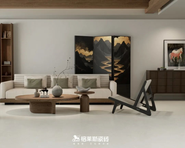 空間摒棄繁復(fù)造型,地面鋪貼淺灰瓷磚,淡雅的淺杏暈染開(kāi)來(lái)的紋理,奠定了靜謐的基調(diào)。深色木材與淺色布藝碰撞的沙發(fā),國(guó)風(fēng)鎏金屏風(fēng)點(diǎn)綴于沙發(fā)與白墻之間,讓色彩厚度在“新”與“中式”之中找到了一個(gè)巧妙的平衡點(diǎn)。