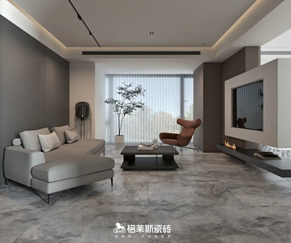 灰色大理石紋理的質(zhì)感高級(jí),為空間奠定大氣基底,與造型簡(jiǎn)約且具藝術(shù)感的沙發(fā)、單人椅相得益彰,材質(zhì)質(zhì)感突出。整體以灰白為主色調(diào)高級(jí)協(xié)調(diào),搭配壁爐、燈具、綠植等軟裝細(xì)節(jié),既讓空間兼具藝術(shù)感與生活氣息,又借由瓷磚與軟裝的融合,營(yíng)造出雅致且富有層次的現(xiàn)代家居氛圍。