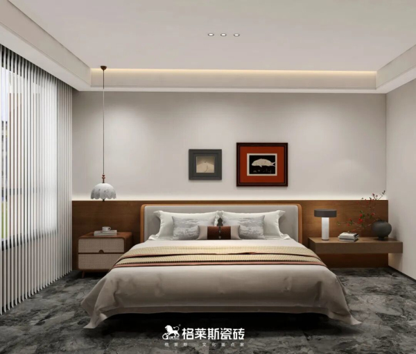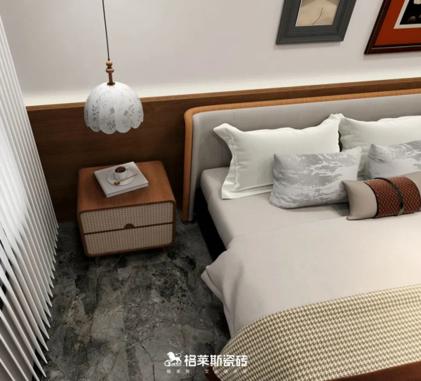 臥室使用搭配木質(zhì)家居,紅棕掛畫(huà)作為點(diǎn)綴,濃厚的復(fù)古意蘊(yùn)讓人溫暖舒心。瓷磚獨(dú)特的干粒釉配方與立體柔拋技術(shù),既保留了自然原生的質(zhì)感與堅(jiān)韌,更賦予了空間如絲織物般的柔美。