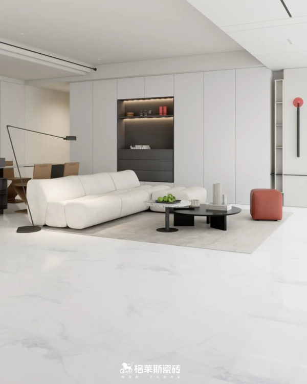 素白色系大理石紋理瓷磚質(zhì)感通透、紋理大氣,光澤15~25度之間柔和護(hù)眼,讓視覺(jué)達(dá)到舒適平衡。以高調(diào)的硬裝質(zhì)感成為空間視覺(jué)焦點(diǎn);背景墻采用大面積白色柜體與深色板材拼接,在材質(zhì)與造型設(shè)計(jì)上盡顯硬裝的極簡(jiǎn)張力。