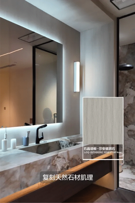 石晶墻板“莎安娜洞石”復刻天然石材的細膩紋理與質感,防水防潮防霉、抗撞易潔的性能,在營造沉穩大氣空間氛圍的同時,確保持久耐用。