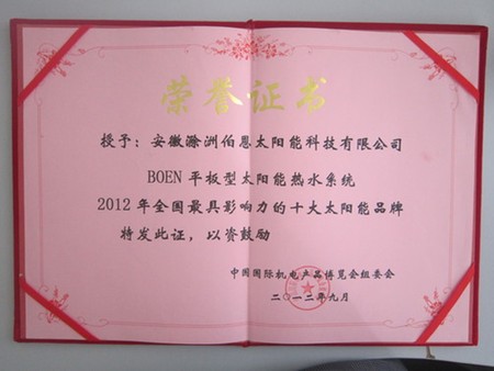 展會上,一家擺放著“大型蘋果手機”的企業展位引起了眾多參觀者的駐足。這是來自安徽的伯恩太陽能科技有限公司生產的平板式太陽能集熱器,因其產品外觀設計酷似蘋果手機,被業界譽為“平板太陽能中的蘋果”。繼北京獲得品牌中國金獎后,伯恩在本次機博會上再度得到市場、行業的認可,一舉斬獲“2012全國最具影響力的十大太陽能品牌”。