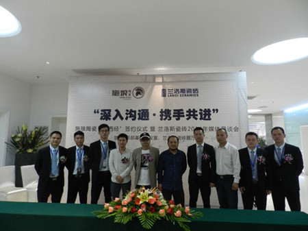 在施瑯陶瓷簡短的“取西經”簽約儀式結束后,范桂明還系統地介紹了蘭洛斯品牌的相關情況,他告訴與會媒體代表,蘭洛斯瓷磚有七大亮點、四大系列,最重要的特點則是配套相當齊全,“我們賣的是空間,配飾也可以在蘭洛斯一站式購齊。”