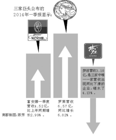 “微信門”其實折射出當前國內家紡業的競爭已達白熱化。作為中國家紡業三巨頭,富安娜、夢潔以及羅萊均為上市公司,從今年一季度業績來看,羅萊家紡實現營業收入6 .5 7億元,同比增長6.82%,凈利潤約0.99億元,增長15 .15%;富安娜營業收入4 .52億元,同比增長2.99%,凈利潤1.01億元,同比增長14 .47%。夢潔家紡實現營業收入3.18億元,同比下降4 .13%,凈利潤僅2845萬元。