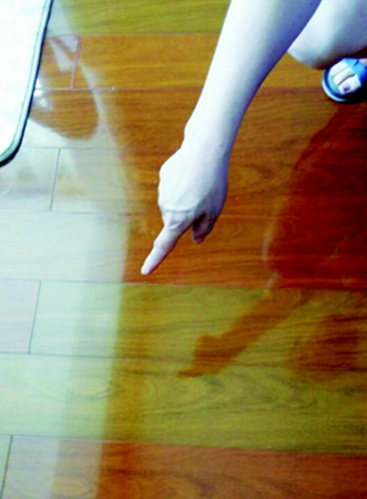 林先生指著地板說,深色地板是地板本來的顏色,淺色的是變色的地板,反差非常明顯。