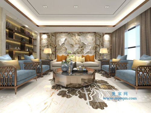 別墅解讀:整個別墅采用新中式風(fēng)格進(jìn)行靈動生態(tài)設(shè)計,營造大道至簡的意境,為居者帶來寧靜、休閑的感覺。客廳中,白色的樹葉似乎和著柔軟的微風(fēng)帶來了舒適的體感。經(jīng)典中式與時尚的結(jié)合,灰玉洞石、奶油玫瑰與檀江飛雪打造的質(zhì)感地面彰顯穩(wěn)重的時尚設(shè)計感,和原生態(tài)的中式家具出現(xiàn)在同一個空間里,卻顯得如此和諧。地上多種不同的拼花設(shè)計簡潔而富有生趣的成熟樣貌,在光和影的協(xié)奏下,古典與時尚的結(jié)合,造就了新的展現(xiàn)形式。