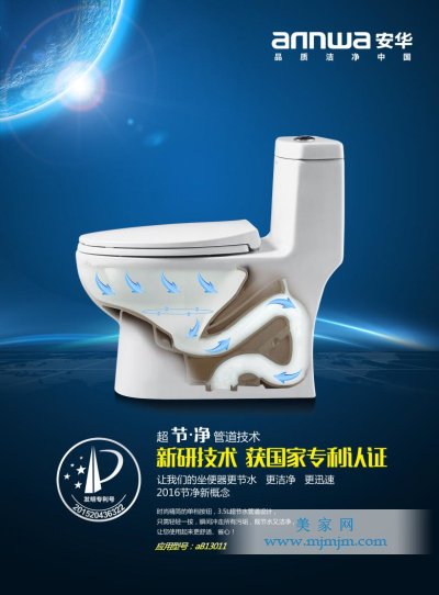 獲國家專利認證的安華“超節凈”管道技術,實現雙水封、雙虹吸力,通過優化特殊單管道管徑設計,沖力更強勁,更少的用水量就能一次沖凈污物。