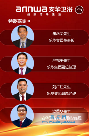 本屆峰會特邀樂華集團董事長謝岳榮先生、樂華集團副總經理嚴邦平先生、樂華集團副總經理劉廣仁先生、安華衛浴事業部副總經理溫尊華先生發表主題演講。此外,研發中心、市場部、銷售部、電商部的領導代表將分別為峰會帶來精彩的工作報告;而來自全國各地的優秀經銷商代表以及重金聘請的金牌講師,也將帶來激動人心的經驗分享和系列課程。