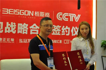 展會首天,栢斯格譚總(東正宏駿總經理)與CCTV央視簽訂戰略合作協議,栢斯格品牌將正式登陸央視頻道,憑借品質傳播價值,栢斯格將不遺余力的推動不銹鋼定制領域,肩負產業升級的重任。
