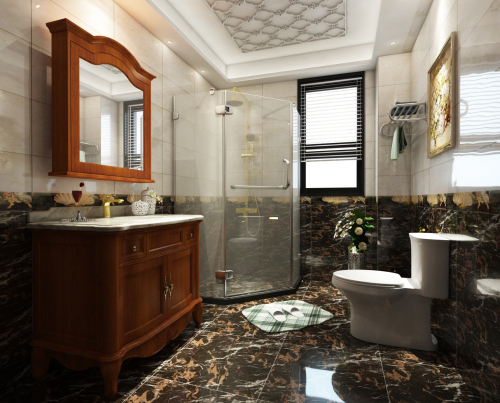 濃郁的米灰色墻板與充滿美式風格的復古質感風格浴室柜形成強烈的撞擊,恰如其分的胡桃色點綴,亦能緩和冰冷浴室帶來的壓抑感。透過復古的風格情調,更顯沉穩、大氣。
