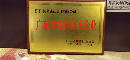 在“一帶一路”粵港澳大灣區(東莞)物流節開幕式暨物流產業聯盟創新年會上,廣東省物流行業協會授予跨越廣東省誠信物流企業獎。