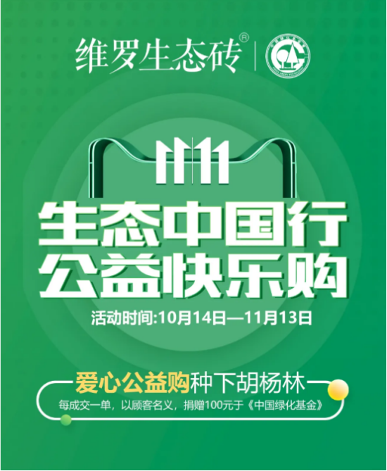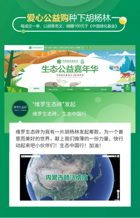 維羅生態磚“生態中國行 公益快樂購”活動期間,每成交一單,以顧客名義,維羅總部捐贈100元于《中國綠化基金》,愛心公益購種下胡楊林。同時,維羅生態磚為我有一片胡楊林發起籌款,目前種植面積10.857畝,種植樹苗1083棵,參與人數2961人,為一個 “綠色生態中國夢” 獻上一份力量。