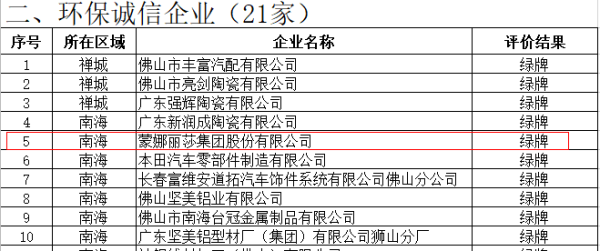 自2015年佛山市實施企業環境信用評價以來,蒙娜麗莎集團一直穩居"環保誠信企業"榜單,已連續5年獲得佛山市企業環保綠牌。