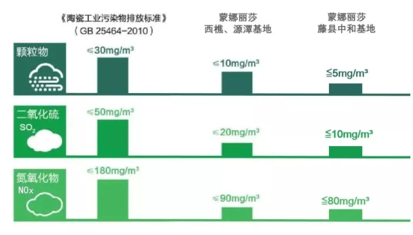 如每一毫克嚴格把控。在蒙娜麗莎內部,一直執行著嚴于國家標準的環境保護企業內控標準。國家規定陶瓷企業排放標準為:顆粒物≤30mg/m³、二氧化硫≤50mg/m³、氮氧化物≤180mg/m³,即"30/50/180"。而蒙娜麗莎集團的內控標準則是"10/20/90",廣西藤縣生產基地則更為嚴格。