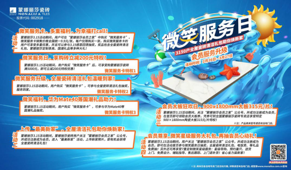 315作為消費者權益日,既是維權服務日也是各類促銷活動的重要時期,蒙娜麗莎瓷磚“微笑服務日”為回饋廣大消費者,推出多項優惠政策,900×1800mm陶瓷大板僅需315元/片起,新老用戶注冊成為蒙娜麗莎瓷磚會員即可參與“最美新家”活動,贏取“全屋瓷磚清潔保養”服務包,還有每日會員免費抽獎等更多驚喜好禮!